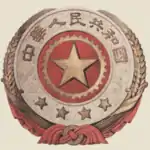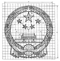 - Los diseñadores de la Academia Central de Bellas Artes de China, Zhang Ding, Zhang Guangyu, Zhou Lingzhao y Zhong Ling, entregaron sus propuestas con 5 variaciones el 25 de septiembre de 1949. El simbolismo de su primer diseño era: La estrella roja simboliza el comunismo y el partido comunista de China. El engranaje y el trigo/arroz simbolizan la unificación de los trabajadores industriales y los campesinos. La tierra ascendente con China en rojo simboliza la revolución socialista en China y la revolución mundial ideal en los países asiáticos. Los 31 rayos detrás de la tierra simbolizan las 31 divisiones administrativas provinciales de la época. El nombre de la República Popular China está escrito en la cinta roja de abajo.[2] El diseño se basó en el diseño del emblema de la Conferencia Consultiva Política del Pueblo Chino, y estuvo influenciado por la heráldica socialista del bloque oriental.