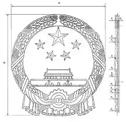 El emblema nacional de la República Popular China contiene en un círculo rojo una representación de la Puerta de Tiananmen, la puerta de entrada a la Ciudad Prohibida, donde Mao Zedong declaró la fundación de la República Popular China (RPC) en 1949. Encima de esta representación están las cinco estrellas de la bandera nacional. La estrella más grande representa al Partido Comunista Chino (PCC), mientras que las cuatro estrellas más pequeñas representan las cuatro clases sociales definidas en el maoísmo. El emblema se describe como "compuesto por patrones de la bandera nacional":