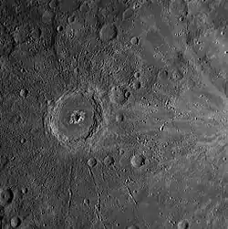 Las eyecciones del impacto y las cadenas de cráteres secundarios se extienden hasta un radio desde el borde del cráter. No hay rayos claros o oscuros, con un borde del cráter de mayor altura que las los llanos circundantes del cráter. Las paredes del cráter están erosionadas, formando diferentes bloques de material. La superficie del cráter está compuesta de estructuras complejas, incluyendo depósitos de eyección, masas fundidas de impacto y posiblemente unidades colocadas por vulcanismo efusivo.[3]