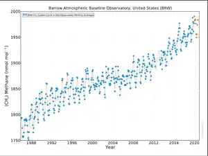 Los hallazgos del estudio basados en la misión CARVE de la NASA concluyeron en 2015 que las emisiones de metano en el Ártico durante la estación fría son más altas de lo que se pensaba. El comunicado de prensa de JPL explicó: [17]