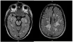 ![]() La leucoencefalitis hemorrágica aguda fulminante muestra muchas lesiones. El paciente sobrevivió, pero permaneció en un estado vegetativo persistente | ||