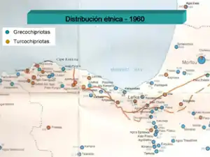 El porcentaje bajó al 36% (252) de 1931. Con el aumento de la campaña cada vez más violenta para la Enosis y la consecuente campaña separatista turca, el porcentaje de pueblos mixtos (bicomunales) cayó a 18% (98) en 1960. En 1970, esta proporción había bajado de nuevo al 10% (48). Actualmente, existe una sola aldea mixta (Pyla).