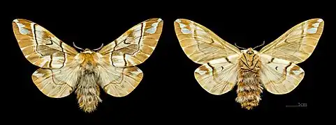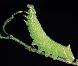 Las pequeñas orugas son de color negro, más tarde adquieren una viva coloración verde, crisalidan en el suelo en un pequeño capullo de seda y tierra, donde permanecen de 1 a 3 años.