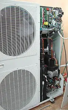 Normalmente un aparato de aerotermia se compone de una unidad exterior (compresor) y otra interior, comunicadas por cables eléctricos y tubos de fluidos.[5] Además de una unidad de almacenamiento ACS, la cual también puede estar incluida en la unidad interior, y de un sistema de calefacción y/o refrigeración.[6]