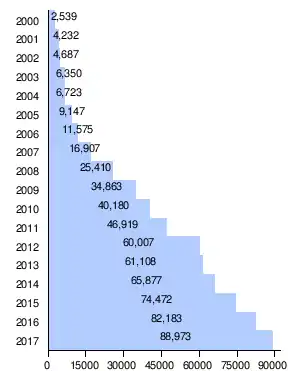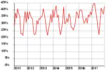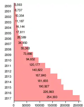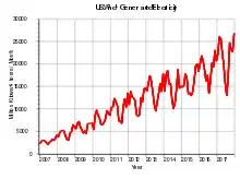 A partir de 2017, los Estados Unidos tienen más de 82 GW de capacidad instalada de energía eólica. [3] La energía eólica ha aumentado dramáticamente en los últimos años. Sin embargo, en 2010, la capacidad de generación recién instalada fue aproximadamente la mitad del año anterior debido a diversos factores, incluida la crisis financiera y la recesión. En 2013 hubo una reducción del 92% en la capacidad de generación recién instalada en comparación con 2012, debido a la extensión tardía del PTC (ver imagen a la derecha). [18] El gráfico a la izquierda muestra el crecimiento en la capacidad de generación eólica instalada en los Estados Unidos según los datos de la Oficina de Eficiencia Energética y Energía Renovable . [19] En 2008, la capacidad instalada en los EE. UU. Aumentó un 50% con respecto al año anterior. La tasa de crecimiento promedio mundial ese año fue de 28.8%. [20]