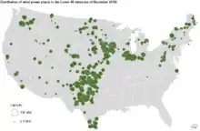 A partir de enero de 2017, la capacidad total instalada de generación de placa de energía eólica en los Estados Unidos fue de 82,183 megavatios (MW). [3] Esta capacidad solo es superada por China y la Unión Europea . [4] Hasta ahora, el mayor crecimiento de la capacidad de la energía eólica fue en 2012, cuando se instalaron 11,895 MW de energía eólica, lo que representa el 26.5% de la capacidad de energía nueva. [1]