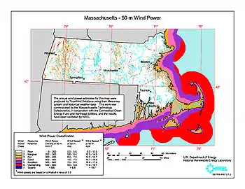 Además de los grandes recursos eólicos en tierra, EE. UU. Tiene un gran potencial de energía eólica marina, [29] con otro informe de NREL publicado en septiembre de 2010 que muestra que EE. UU. Tiene 4.150 GW de capacidad potencial de placa de energía eólica marina, una cantidad de 4 Veces la capacidad instalada del país en 2008 de todas las fuentes, de 1.010. GW. [30]
