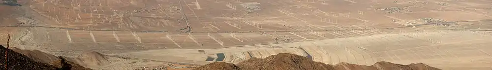 Grandes porciones de la producción eólica de California, están ubicadas en tres regiones principales: Altamont Pass Wind Farm (al este de San Francisco); Tehachapi Pass Wind Farm (al sureste de Bakersfield), y San Gorgonio Pass Wind Farm (cerca de Palm Springs, al este de Los Ángeles). El nuevo y gigantesco Centro de Energía Eólica Alta, también se encuentra dentro de la región del Paso Tehachapi. [47]