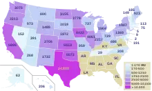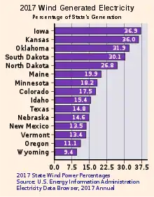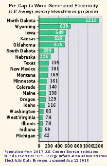 En 2016, Nebraska se convirtió en el decimoctavo estado en instalar más de 1.000 MW de potencia eólica. [3] Texas, con más de 22,000 MW de capacidad, aproximadamente el 15% del uso de electricidad del estado, tenía la capacidad de energía eólica más instalada de todos los estados de EE. UU. A fines de 2018. [5] Texas también tenía más en construcción que cualquier otro estado que haya instalado actualmente. [3] El estado que genera el mayor porcentaje de energía proveniente de la energía eólica es Iowa, [6] mientras que Dakota del Norte tiene la mayor generación eólica per cápita.