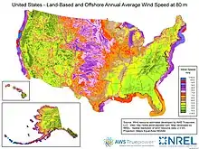 Según el Laboratorio Nacional de Energía Renovable, los Estados Unidos contiguos tienen el potencial de 10,459 GW de energía eólica terrestre. [24] [25] La capacidad podría generar 37. petawatt-hours (PW · h) anualmente, una cantidad nueve veces mayor que el consumo total actual de electricidad en los EE . UU . [26] Los Estados Unidos también tienen grandes recursos eólicos en Alaska, [27] y Hawái. [28]