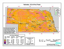La energía eólica en Nebraska permanece en gran parte sin explotar en comparación con su potencial. En las Grandes Llanuras, con más de 47,000 granjas y cielos abiertos, ocupa el primer lugar en los Estados Unidos en su capacidad para generar energía a partir del viento. [1] A partir de 2016, Nebraska tenía 1,335 MW de capacidad instalada de generación de energía eólica, produciendo el 10,1% de la electricidad generada en el estado. [2] A partir de 2015, el estado no había adoptado un estándar de cartera renovable . [3] El Distrito de Energía Pública de Omaha (OPPD) es uno de los mayores compradores de energía eólica del estado. [4]