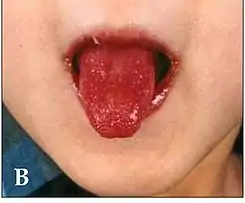 ![]() Niño con lengua en fresa característica de la enfermedad de Kawasaki. | ||