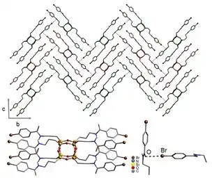 La ingeniería de cristales es un área de investigación en crecimiento que conecta la química del estado sólido con la química supramolecular.[21] Este campo es multidisciplinario y combina disciplinas tradicionales como la cristalografía, la química orgánica y la química inorgánica. En 1971, G. Schmidt estableció las bases del campo con una publicación acerca de la fotodimerización en estado sólido.[22] La definición más reciente identifica la ingeniería de cristales como el uso de interacciones intermoleculares para la cristalización y el desarrollo de nuevas sustancias con diferentes propiedades fisicoquímicas. Previo al descubrimiento del enlace de halógeno, la ingeniería de cristales involucraba el uso de puentes de hidrógeno, química de coordinación e interacciones inter-iónicas para el desarrollo de líquidos cristalinos y sólidos cristalinos. El puente de halógeno es utilizado para la organización de sales de radicales catiónicos, fabricación de conductores moleculares y la creación de cristales líquidos. Desde el descubrimiento del puente de halógeno, nuevas entidades moleculares han sido sintetizadas.[23] Debido a la naturaleza química inusual de enlace de halógeno, se ha utilizado como herramienta adicional en el desarrollo de la ingeniería de cristales.[24]