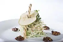 La ensalada Waldorf es un plato que consiste en manzanas ácidas troceadas, frutos secos (en especial nueces), apio - tubérculo, o julianas de repollo blanco con las hojas o troncos del apio picada y mayonesa o algún aliño basado en la mayonesa. Se sirve tradicionalmente con lechuga y algunas pasas que le dan un 'toque' dulce, o queso azul para lo contrario.