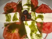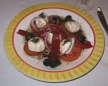 La ensalada caprese, o simplemente caprese, es una ensalada italiana (concretamente de Capri) compuesta de rodajas de tomate y de mozzarella fresca, y hojas de albahaca fresca, de la variedad "hoja grande" y "superhoja", regado con aceite de oliva. Se le puede agregar pimienta en grano molida en cualquiera de sus variedades o una mezcla de ellas, llegando incluso a usarlas a todas juntas. Comúnmente, aunque no por regla general, se adereza con salsa pesto (albahaca, ajo, piñones, queso parmesano y aceite de oliva) y reducción de vinagre balsámico.
