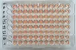A continuación, se añade una cantidad estandarizada de eritrocitos a cada pocillo y se le permite la incubación a temperatura ambiente durante 30 minutos más. Las imágenes de la placa HI resultantes suelen evolucionar desde no aglutinadas, con los pocillos «botón» con elevada concentración de anticuerpos, hasta aglutinadas, con los pocillos rojos difusos con baja concentración de anticuerpos. El valor del título de HI es el inverso de la última dilución de suero que inhibió completamente la hemaglutinación. [7]
