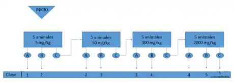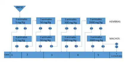 El experimento comienza administrando la dosis letal más tóxica (5 mg/kg) a un grupo de 5 animales. Nos podemos encontrar ante tres situaciones; en caso de que mueran dos o más animales, la sustancia se clasifica en la clase 1. Si muere un animal o ninguno pero presenta efectos tóxicos, se introduce en la clase 2. Por último, si no muere ninguno ni observamos signos de toxicidad, no se clasifica, si no que se repite el experimento con otros cinco animales y con la dosis siguiente (50mg/kg). En caso de que mueran dos o más animales con esta dosis, se clasifica la sustancia en la clase 2. Si muere uno o ninguno pero presentan signos de toxicidad, la sustancia pertenece a la clase tóxica 3. Si no se observa ningún signo de toxicidad se continuará el experimento con la dosis de 300 mg/kg y así sucesivamente con las siguientes dosis. [4]