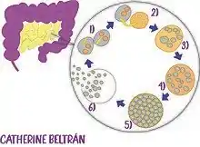 El Ciclo de vida de Enterocytozoon bieneusi. La forma infecciosa de los microsporidios es la espora, que puede sobrevivir durante largo tiempo en el medio ambiente (1). La espora expulsa su túbulo polar e infecta a la célula hospedera donde la espora inyecta el esporoplasma en la célula eucariótica hospedera a través del túbulo polar (2). Dentro de la célula, el esporoplasma sufre multiplicación extensa ya sea por merogonia (fisión binaria) o esquizogonia (fisión múltiple) (3). Este desarrollo ocurre en contacto directo con el citoplasma de la célula hospedera. Ya sea libre en el citoplasma o en el interior de una vacuola parasitófora, los microsporidios se desarrollan por esporogonia en esporas maduras (4). Durante la esporogonia, una pared gruesa se forma alrededor de la espora, que proporciona resistencia a las condiciones ambientales adversas (5). Cuando las esporas aumentan en número y llenan completamente el citoplasma de la célula huésped, la membrana celular se rompe y libera las esporas a los alrededores (6). Estas esporas maduras libres pueden infectar nuevas células continuando así el ciclo.[4]