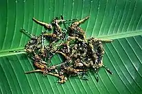 - Cigarras, chicharras, coyuyos, coyoyos, chiquilichis, tococos, cocoras, cocorrínes, cogollos, ñes, ñakyrã o totorrones, son insectos de la familia Cicadidae, que pueden vivir tanto en climas templados como tropicales. Las ninfas viven enterradas mientras que los adultos viven sobre vegetales. Se consumen en estado adulto las especies de los géneros Cicada, principalmente: (Tibicen) pruinosus (Say, 1825)[41]; Odopoea, principalmente: montezuma (Distant, 1881), su sinónimo es Daza montezuma (Walker, 1850)[42]; Proarna (Cacama), principalmente: maura (Distant, 1881) y Quesada (Tympanotermes), principalmente: gigas (Olivier, 1790) conocida comúnmente como cigarra común.[39]