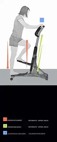 El ejercicio es similar al del esquí nórdico por el movimiento hacia adelante de los pies y el ayudarse con los brazos, el cual se combina con un movimiento circular como el pedaleo de la bicicleta. Está destinado a gente que no posee tiempo para hacer deportes o asistir a un gimnasio, aunque también se la encuentra en todo gimnasio bien equipado. Junto con la bicicleta estática es uno de los aparatos deportivos más populares para el ejercicio aeróbico. Se recomienda que tenga un volante de cierto peso (6 kg o más) lo que le da al aparato mayor inercia y menor desgaste.