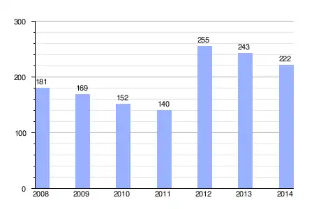 Gráfica de evolución de la deuda viva del ayuntamiento entre 2008 y 2014 |