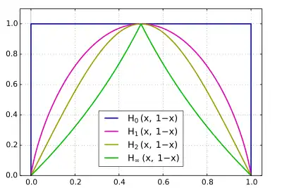 Aquí, es una variable aleatoria discreta con resultados posibles y probabilidades correspondientes para , y el logaritmo es de base 2. Si las probabilidades son para todo , entonces todas las entropías de Rényi de la distribución son iguales: . En general, para todas las variables aleatorias discretas , es una función no creciente de .