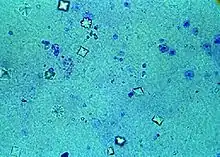 Otra anomalía que puede indicar envenenamiento por etilenglicol es la acidosis metabólica, particularmente si se presenta una gran brecha aniónica. Sin embargo, la acidosis también se puede presentar en casos de ingesta de metanol, salicilatos, hierro, isoniazida, paracetamol, teofilina o por condiciones tales como la uremia o la cetoacidosis diabética o alcohólica.[5] La presencia de cristales de oxalato de calcio en una microscopía de orina puede corroborar la intoxicación, aunque estos cristales no se suelen formar hasta la última fase del envenenamiento, por lo que diagnóstico es tardío.[29] Finalmente, muchos anticongelantes comerciales tienen fluoresceína, compuesto agregado para permitir detectar fugas en el radiador usando una lámpara de luz negra. Si se ha producido la ingestión de estos anticongelantes, se puede detectar la fluorescencia en la boca, la ropa, el vómito o en la orina del paciente, lo que puede ayudar a diagnosticar el envenenamiento.[30][31]