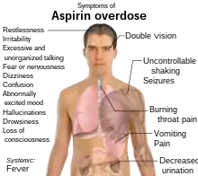 El envenenamiento por salicilato, también conocido como envenenamiento por aspirina, es el envenenamiento agudo o crónico por un salicilato, como la aspirina.[1] Los síntomas clásicos son zumbidos en los oídos, náuseas, dolor abdominal y una rápida respiración.[1] Al principio, estos pueden ser sutiles, mientras que las dosis más grandes pueden causar fiebre.[1][4] Las complicaciones pueden incluir edema cerebral o de los pulmones, convulsiones, niveles bajos de azúcar en la sangre o paro cardíaco.[1]