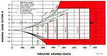 La gráfica de velocidad vs factor de carga (o diagrama V-n) es otra manera de mostrar los límites de rendimiento de las aeronaves. Muestra el límite de factor de carga a diferentes velocidades.[3]