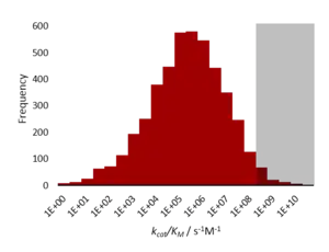 Las enzimas cinéticamente perfectas poseen una constante de especificidad, kcat/Km, en el oreden de 108 a 109 M−1 s−1. Donde la velocidad de la reacción catalizada por la enzima se encuentra limitada por difusión, y por lo tanto la enzima "procesa" al sustrato en su sitio activo, antes incluso de que otra molécula de sustrato pueda ingresar.[1])