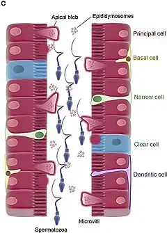 Durante el tránsito de los espermatozoides a lo largo del epidídimo, se producen una amplia variedad de cambios en el entorno de la luz del túbulo. Estos cambios incluyen la liberación y absorción de fluidos, iones, antioxidantes y los exosomas conocidos como epididimo-somas.[14]