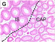 El cuerpo y la cola están recubiertos con un epitelio pseudoestratificado cilíndrico con estereocilios. La altura de las células y de los cilios disminuye hacia la cola.[9] [10]