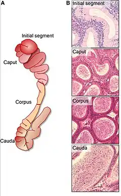 El epidídimo está conformado en la cabeza (caput) por conductillos eferentes, que parten de la rete testis,[8] y en el cuerpo y la cola por el conducto epididimario.