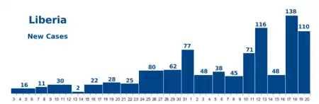 Estas gráficas muestran la cronología a partir de los datos recopilados en el artículo en inglés. En barras azules se observan los nuevos casos que surgen durante los primeros meses en Liberia. El eje horizontal indica bajo cada barra el día de mes entre las fechas indicadas.[cita requerida]
