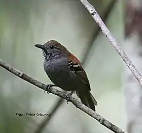 ![]() Ejemplar de hormiguerito del Roosevelt (Epinecrophylla dentei) en Machadinho d'Oeste, estado de Rondonia, Brasil. | ||