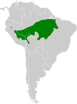 Se distribuye por la región amazónica, al sur del río Amazonas en Brasil, norte de Bolivia y este y sureste de Perú.[5] Ver más detalles en Subespecies.