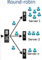 - Round-Robin: las peticiones son distribuidas entre los servidores de forma cíclica, independientemente de la carga del servidor. Distribuye las peticiones de forma ecuánime pero la carga no.