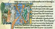 ![]() Eremaro, recibiendo la Vera Cruz de Antioquía. Tomado de Guillermo de Tiro, Histoire d'Outremner | ||