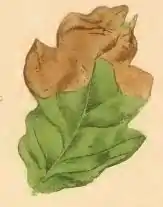 Mina en hoja de roble por larva de Dyseriocrania subpurpurella