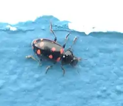 Por lo general las manchas presentes en el pronoto y en los élitros están muy reducidas y bien separadas, incluyendo ejemplares casi totalmente negros, aunque, dada la variabilidad de la especie, también se han observado algunos ejemplares con las manchas bien desarrolladas e incluso unidas entre sí. Las manchas anaranjadas de los élitros pueden estar teñidas por franjas blancas y las manchas del pronoto, blancas o amarillas pueden presentar zonas de color anaranjado. Las manchas también pueden variar del color marfil al rojo, aún en el mismo individuo.[2][8] Los especímenes resguardados en museos pueden presentar una variación respecto de los colores de los ejemplares vivos.[2]
