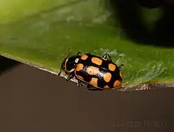 Tiene forma de óvalo color negro con manchas anaranjadas. Tiene la cabeza negra, el pronoto tiene bordes de color anaranjado y una mancha redonda en la base de color más claro. Sus alas duras (élitros) presentan siete manchas oblongas y cuatro discales, todas ellas separadas, aunque en algunas variantes, las manchas pueden llegar a estar unidas longitudinalmente. Tiene antenas marrones.