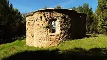 Se conserva en pie lo que fue la cabecera de este edificio, compuesto en planta por tres ábsides semicirculares en torno a un espacio central de planta cuadrada. El cuarto lado se ocupaba por la nave, de la que hoy día sólo quedan ligeras referencias en planta. Debajo de esta estructura se encuentra una cripta, la única detectada en este ámbito geográfico.