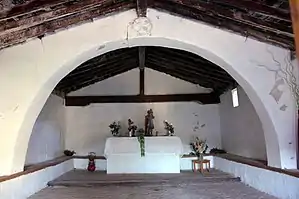 ![]() Vista parcial interior de la Ermita de San Cristóbal en Tormón (Teruel), con detalle del arco de diafragma y el presbiterio al fondo (2017). | ||