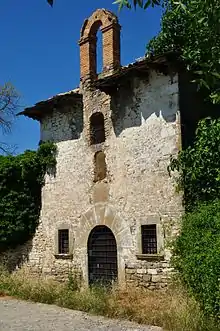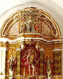 Sobre la inscripción existe una hornacina de medio punto que posiblemente albergaba la imagen del santo titular. Tiene dos ventanas rectangulares con postigos y reja. La cubierta es de teja, a cuatro aguas, con alero de madera y lajas de piedra.