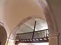 La bóveda del presbiterio es ovalada y ciega y se alza sobre una cornisa de color rosa imitando mármol.