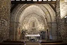 Dos de sus huecos tienen especial interés: el acceso y la ventana del ábside. El primero se abre a través de arco ligeramente apuntado y abocinado, con tres arquivoltas al exterior. Se apoya en imposta que reposa en columnas acodilladas de basas cúbicas, fustes de sección circular de dos piezas y capiteles troncopiramidales. La ventana del ábside tiene un profundo abocinamiento, es de arco de medio punto flanqueado por dos columnillas acodilladas con fustes decorados.