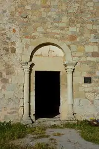 La puerta de acceso al templo está en la fachada de poniente (fachada de los pies). Tiene arco de medio punto que descansa sobre los cimacios de las columnas.