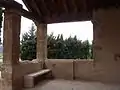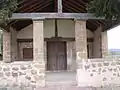 El elemento más característico del edificio es el porche delantero. En este punto, en tejado se apoya sobre vigas de madera dispuestas formando una armadura de par con pendolón,[3] apoyada sobre cuatro pilares cuadrados. Estos se apoyan en un antepecho que cierra la parte baja del conjunto y que se abre en su cara frontal, permitiendo el acceso.[2]