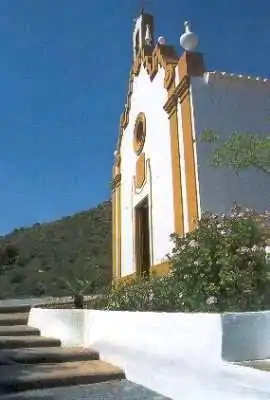 El templo presenta un aire barroco, con paredes blancas y detalles resaltados en color ocre. En la fachada, se abre un gran óculo redondo, y está rematada en cornisa mixtilínea adornada con jarrones y sobre la cual se levanta la espadaña con arco de medio punto, decorada en los laterales con unas molduras y remate por una cruz con veleta, y hueco para una sola campana.