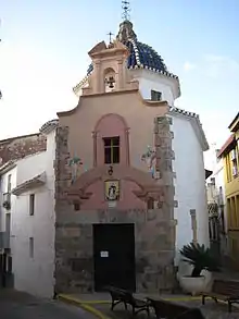 En la fachada exterior se puede ver un panel devocional de cerámica representando al Santo titular (siglo XIX).